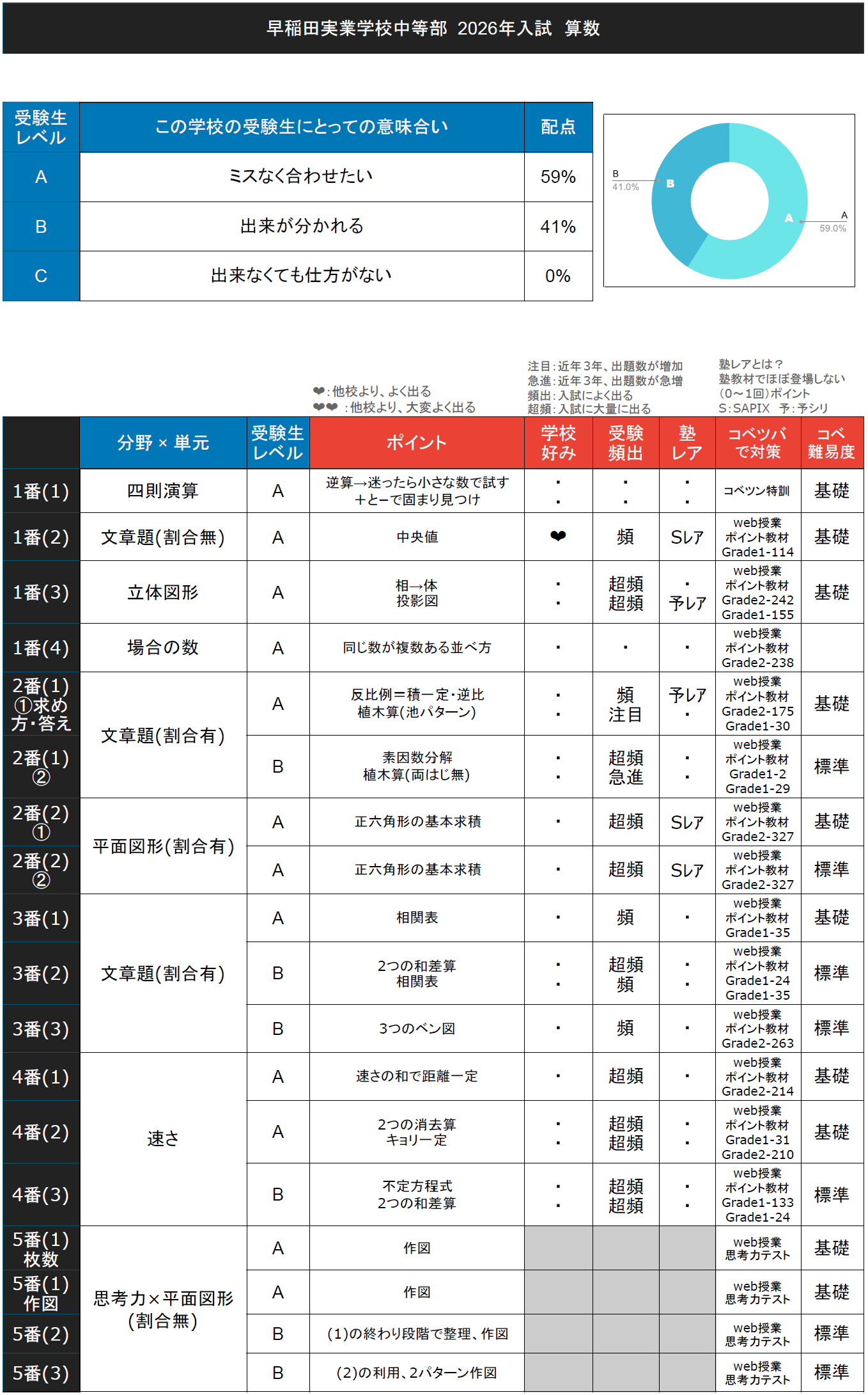 早実は出題の振れ幅が大きく、技術系中心から思考力系中心まで過去のセットでは出題しています。2026、2025年は大問1問、2023年は大問2問、思考力の出題がありました。従って、思考力問題に対しての対応力は疎かにすることはできませんので、継続的に受験本番まで磨いていくことが望まれます。