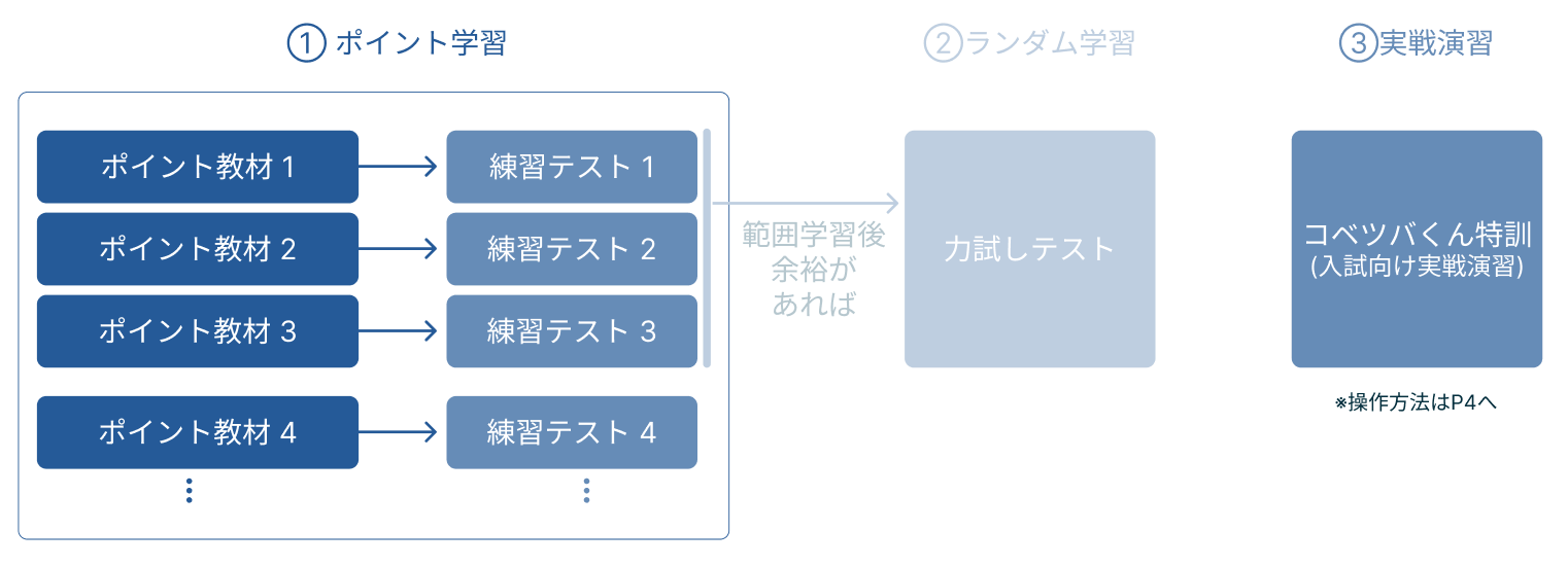 塾や過去問の教材でつまずいており基礎的な練習をしたい方は、①ポイント教材 > 練習テスト の順序で学習を進めてください。基礎的な練習ではなく、追加のバリエーションや実戦演習が欲しい時は、③コベツバくん特訓に進みましょう。