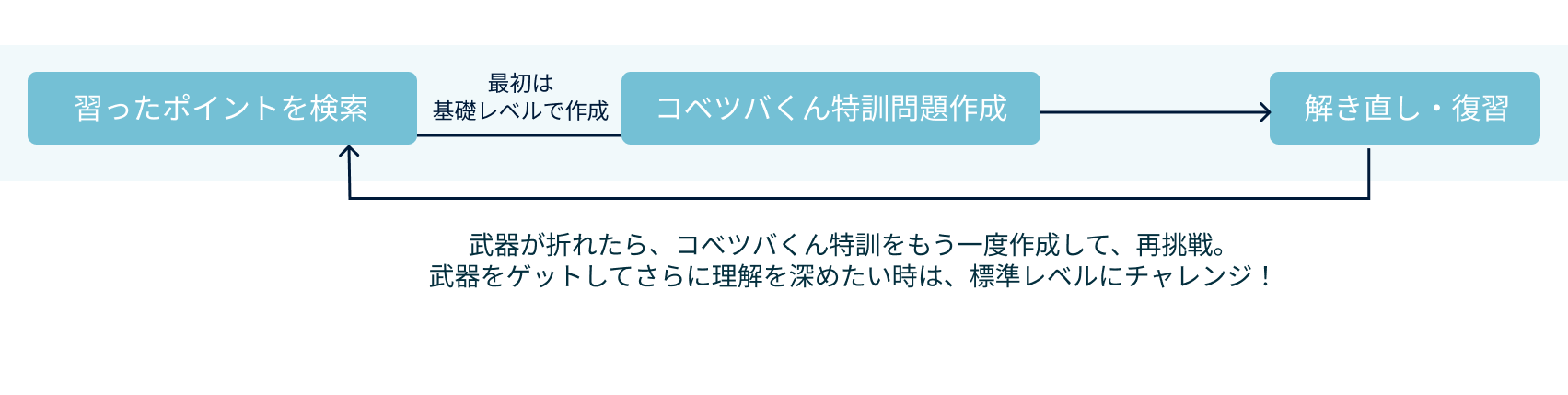 各ポイントの学習が完了したら、コベツバくん特訓で剣1本以上の武器1個に絞り、特訓を作成してください。作成した問題で実戦演習を積みましょう。コベツバでは正解すると武器がもらえる仕組みとなっています。間違えた問題もしっかり復習して自信をつけたら武器が増えるまで2-3回トライしましょう!