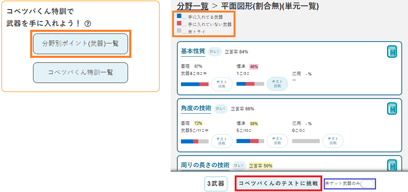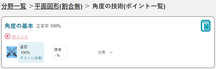 単元から「詳しく」をクリックすると、その単元に含まれる”ポイント”ごとの武器の獲得状況を見ることができます。剣が獲得できてないポイントだけに絞って、ピンポイントで1つずつ再挑戦したい時に活用しましょう。