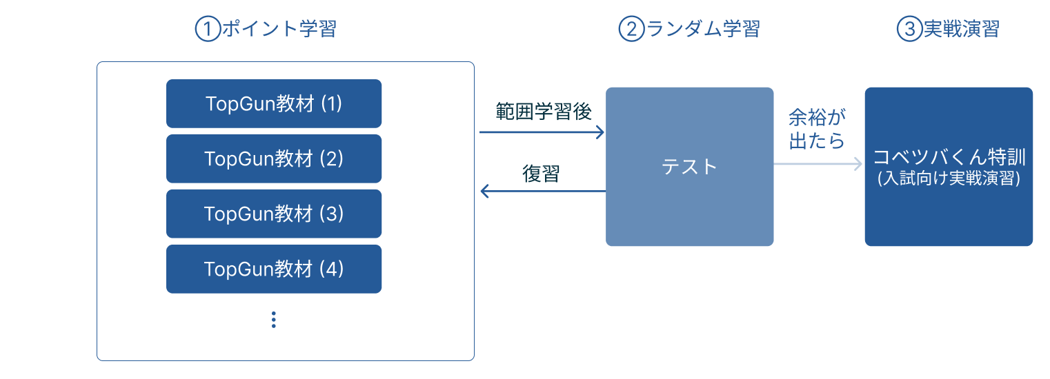 TopGun特訓に取り組むときは、ポイント学習 > ランダム学習 > 実戦演習の順に学習しましょう。