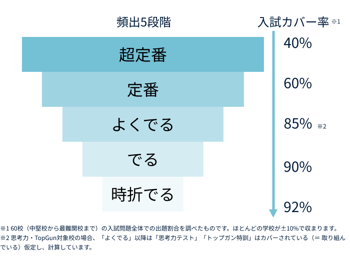 ポイント教材でも学習してきた、入試で出題されるポイント(技術)を、5つの頻出度に分けています。頻出度は、中学入試 約60校の10年間の出題分析データに基づいています。超定番ポイントから対策していくことで、入試までのタイムリミットの中で最大限の効果を得ることができます。超定番・定番までは、全分野取り組めるのが理想ですが、志望校で問われやすい分野を選んで、「超定番・定番」からスタートすることもできます。過去問演習と併用することで、スキのない志望校対策が仕上がります。