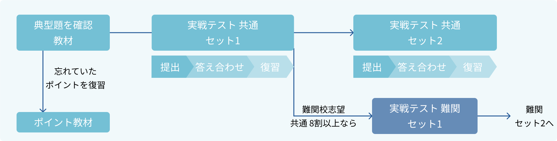「典型題を確認」で技術の型を軽くおさらいできます。忘れているポイントやまだ習っていないポイントがあっても、すぐにポイント教材で豊富な例題で使い方を学習できます。実戦テストは、全員「共通 セット1」から取り組みましょう。セット1の点数に関わらず、超定番・定番ポイントや志望校対策分野であればセット2まで進めるのが良いでしょう。難関校志望の方は、「共通 セット1」に取り組み、調子がよければ「難関 セット1、2」に挑戦しても良いでしょう。