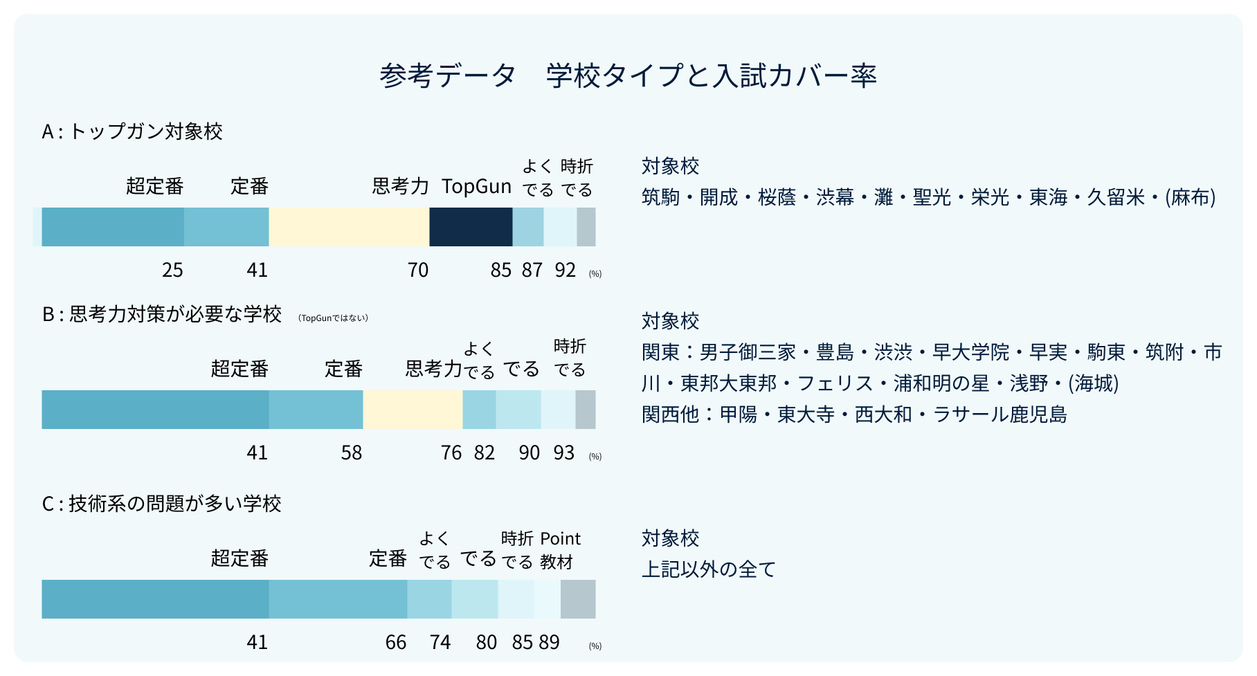 難関校ではレベルB=合否を分ける、トップガン対象校ではレベルA〜Bの問題群です。コベツバの入試難易度では「標準・応用」です。