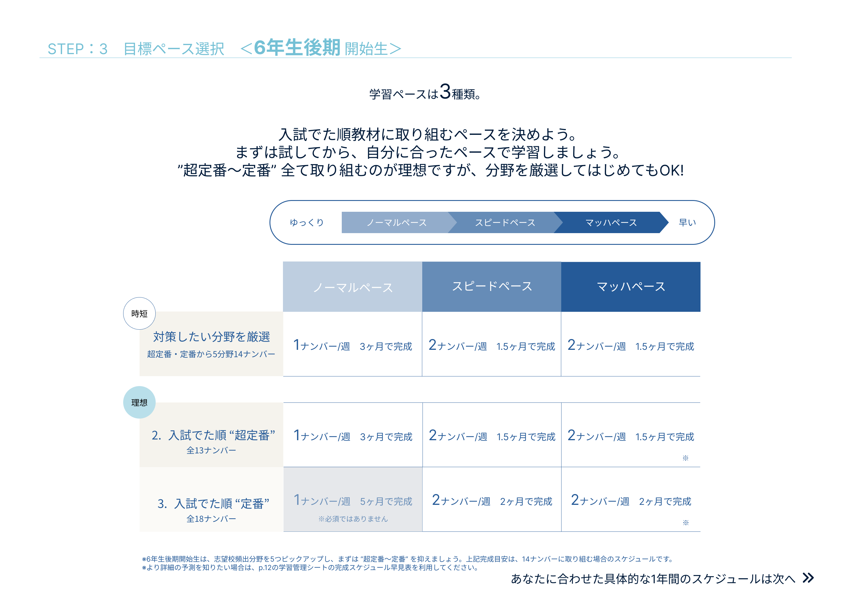 このコースのメインは「入試でた順教材」で、これまで学んだ技術の総点検と入試実戦訓練を行うことです。学校を問わずよく出る「超定番・定番」はできるだけ全ての分野を、そこから先は「合格処方箋(志望校別処方箋)」を参考に、分野を厳選して深く・広く学習しましょう。トップガン特訓の対象校の志望者は志望校頻出分野から、トップガン特訓も攻略していこう。最後のラストスパートは、7500問の中からあなたに最適な問題を出題する「コベツン特訓」で仕上げを行いましょう。