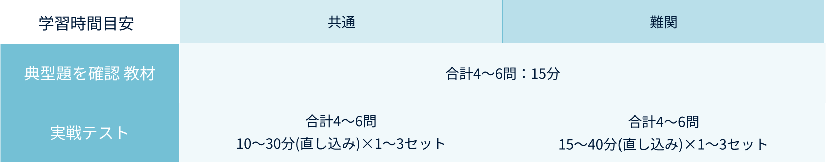 「典型題を確認」で技術の型を軽くおさらいできます。忘れているポイントやまだ習っていないポイントがあっても、すぐにポイント教材で豊富な例題で使い方を学習できます。実戦テストは、全員「共通 セット1」から取り組みましょう。セット1の点数に関わらず、超定番・定番ポイントや志望校対策分野であればセット2まで進めるのが良いでしょう。難関校志望の方は、「共通 セット1」に取り組み、調子がよければ「難関 セット1、2」に挑戦しても良いでしょう。