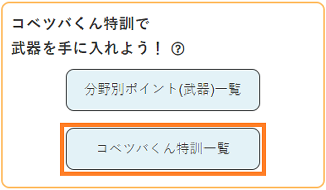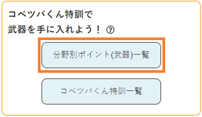 コベツバ学習ホームの下部に「分野別ポイント(武器)一覧」ボタンがあります。