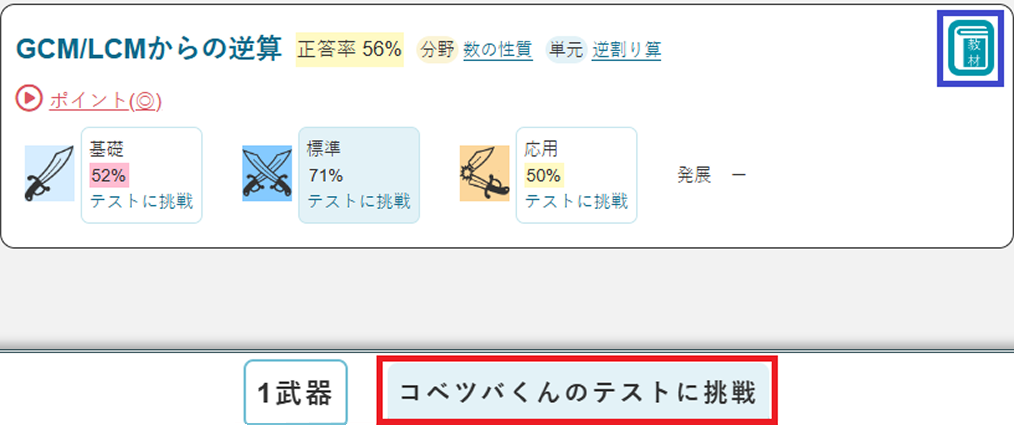 ポイント毎に類題演習ができるコベツバくん特訓での学習が中心となります。よりオーソドックスな問題で復習する場合、そのポイントの「ポイント教材」に戻りましょう。