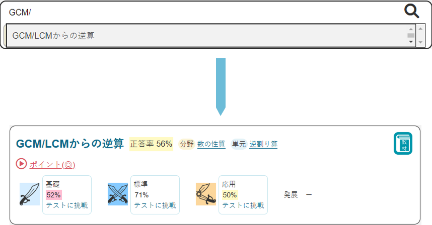 実際のコベツバの画面で補強するポイントに対応する問題を探し、問題を見つけるところまでの流れをご説明します。