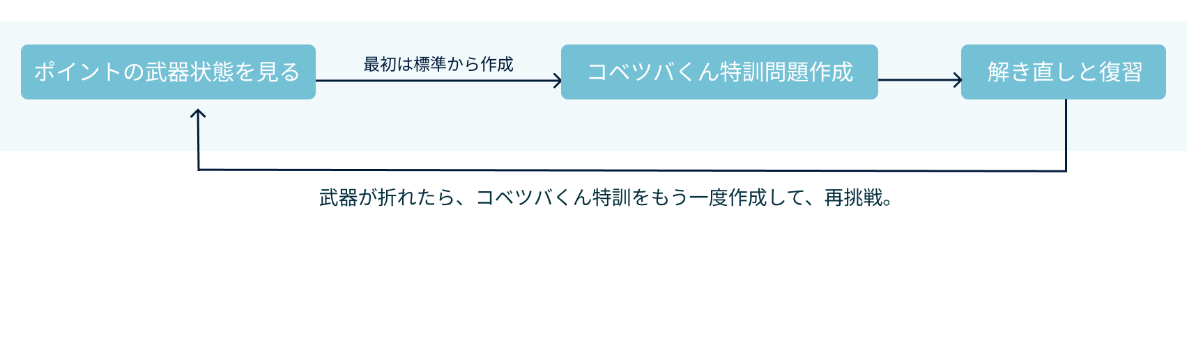 追加演習したいポイントを決めて、コベツバくん特訓で特訓を作成してください。作成した問題で実戦演習を積みましょう。コベツバでは正解すると武器がもらえる仕組みとなっています。武器が増えるまで2-3回トライしましょう!