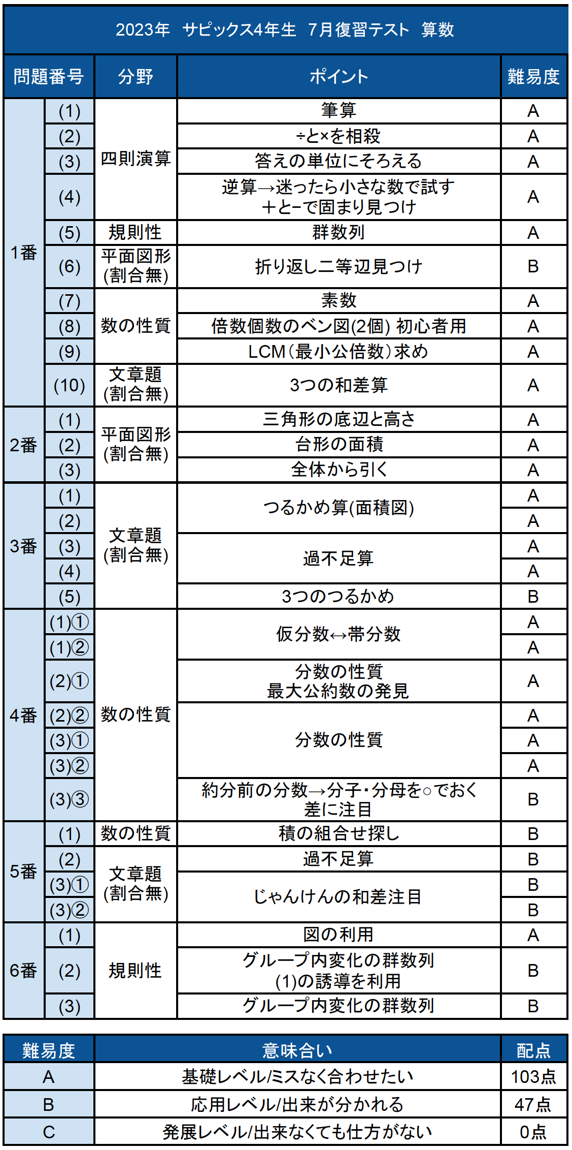 コベツバでは、2023年7月18日、7月19日実施、サピックス4年生7月復習テストの平均点・対策・算数解説・難易度・所感を公開中です。