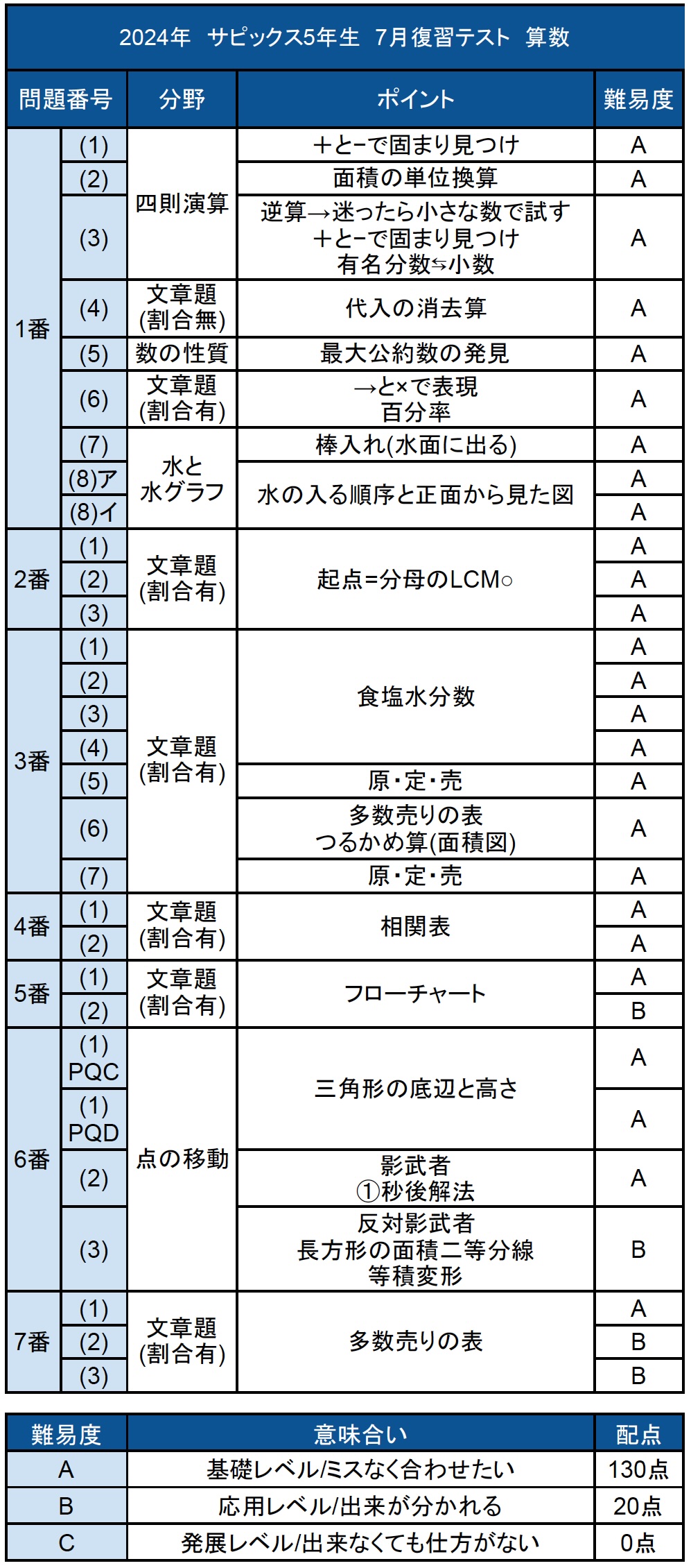 コベツバでは、2024年7月19日実施、 サピックス5年生 7月復習テストの算数解説・難易度・所感を公開中です。