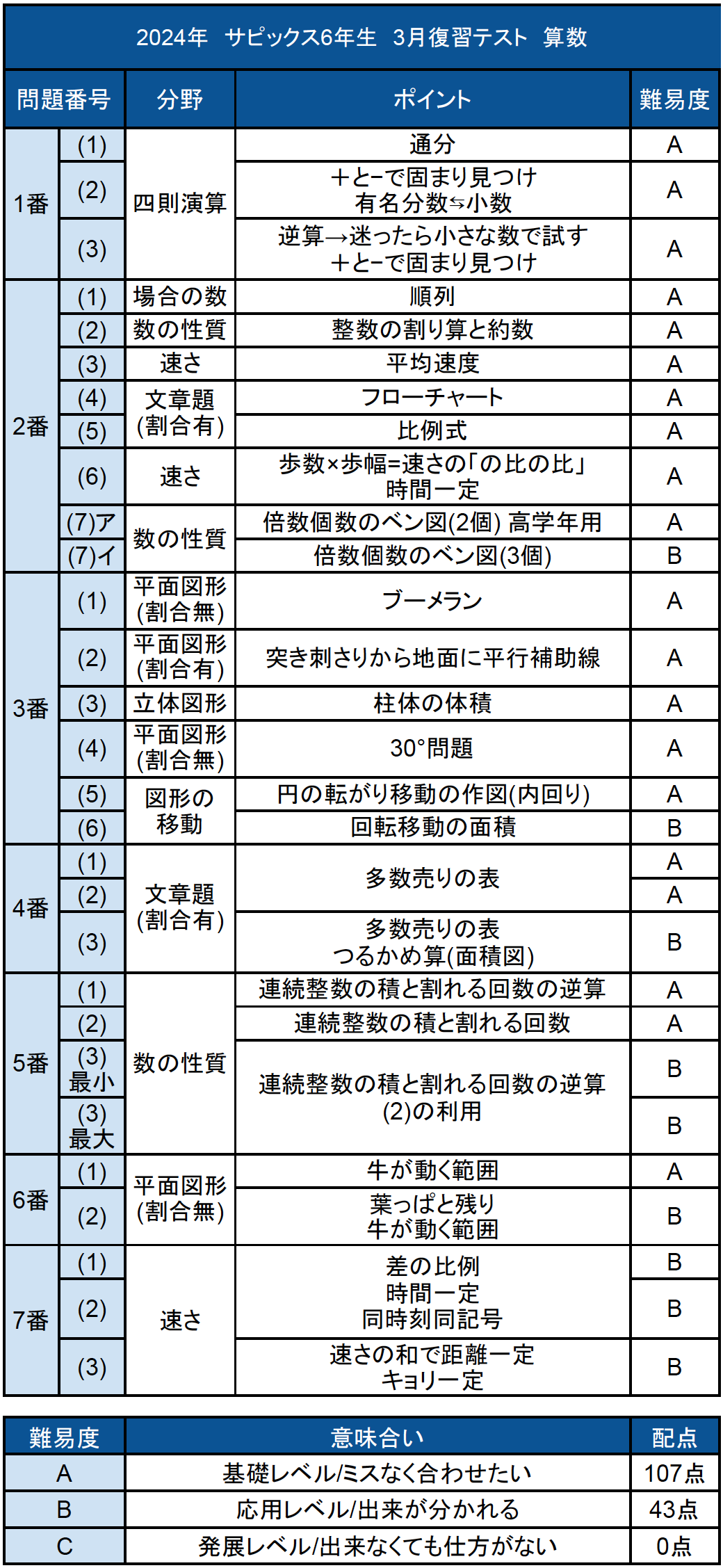 全体感を見ていきますと、レベルAが107点、残りがレベルB43点と標準的な難易度セットとなりました。