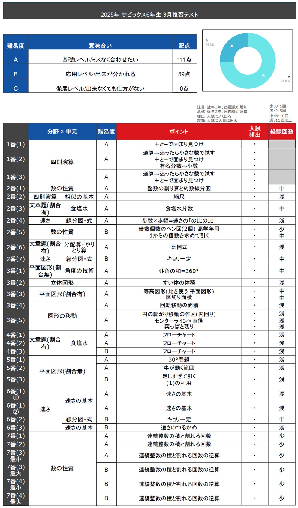 全体感を見ていきますと、レベルAが111点、レベルBが39点と一般的な月毎テストとしては標準的な難易度セットとなりましたが、過去の年度に比べるとやや易し目の内容となりました。