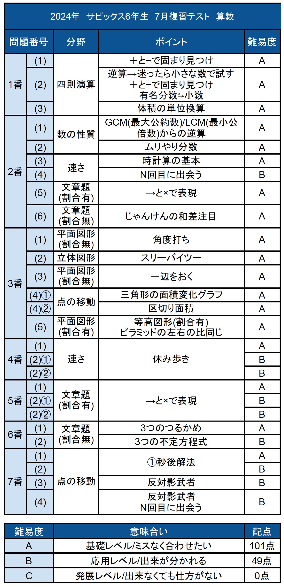 コベツバでは、2024年7月13日・7月20日実施、 サピックス6年生7月復習テストの算数解説・難易度・所感を公開中です。