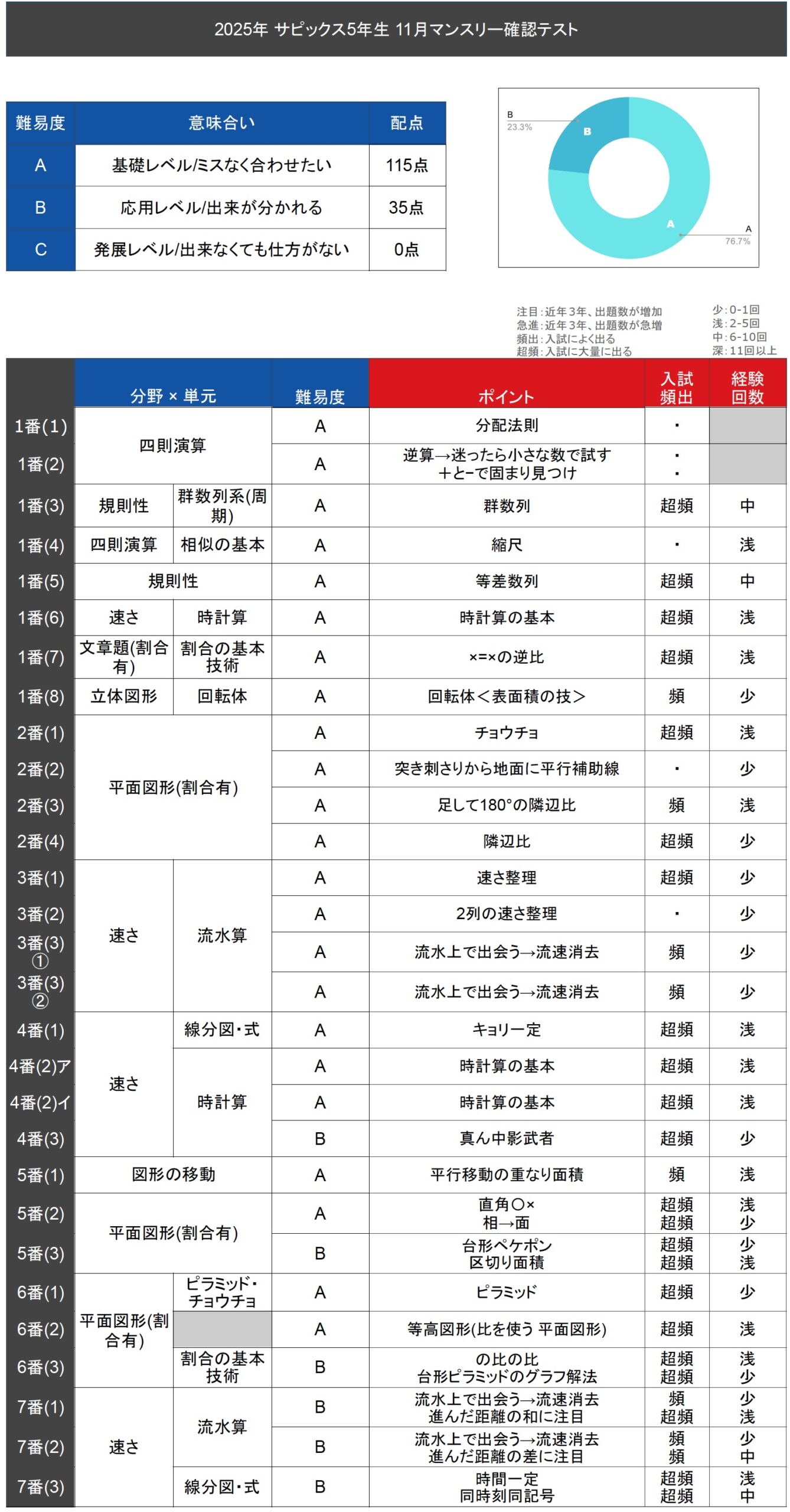 コベツバでは、2025年11月12日実施、 サピックス5年生 11月マンスリー確認テストの算数解説・難易度・所感を公開中です。