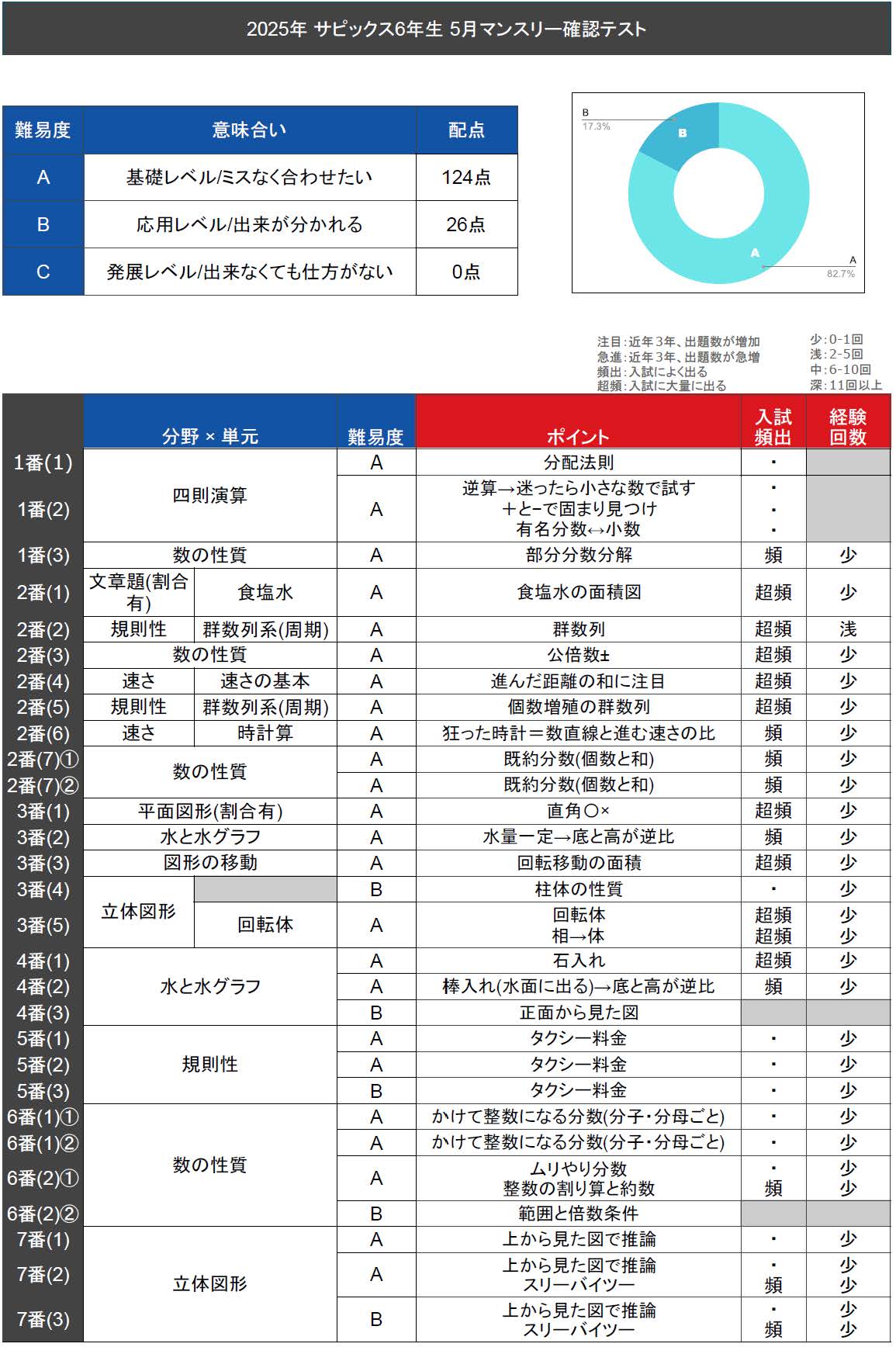 コベツバでは、2025年5月15日実施、 サピックス6年生5月マンスリー確認テストの算数解説・難易度・所感を公開中です。