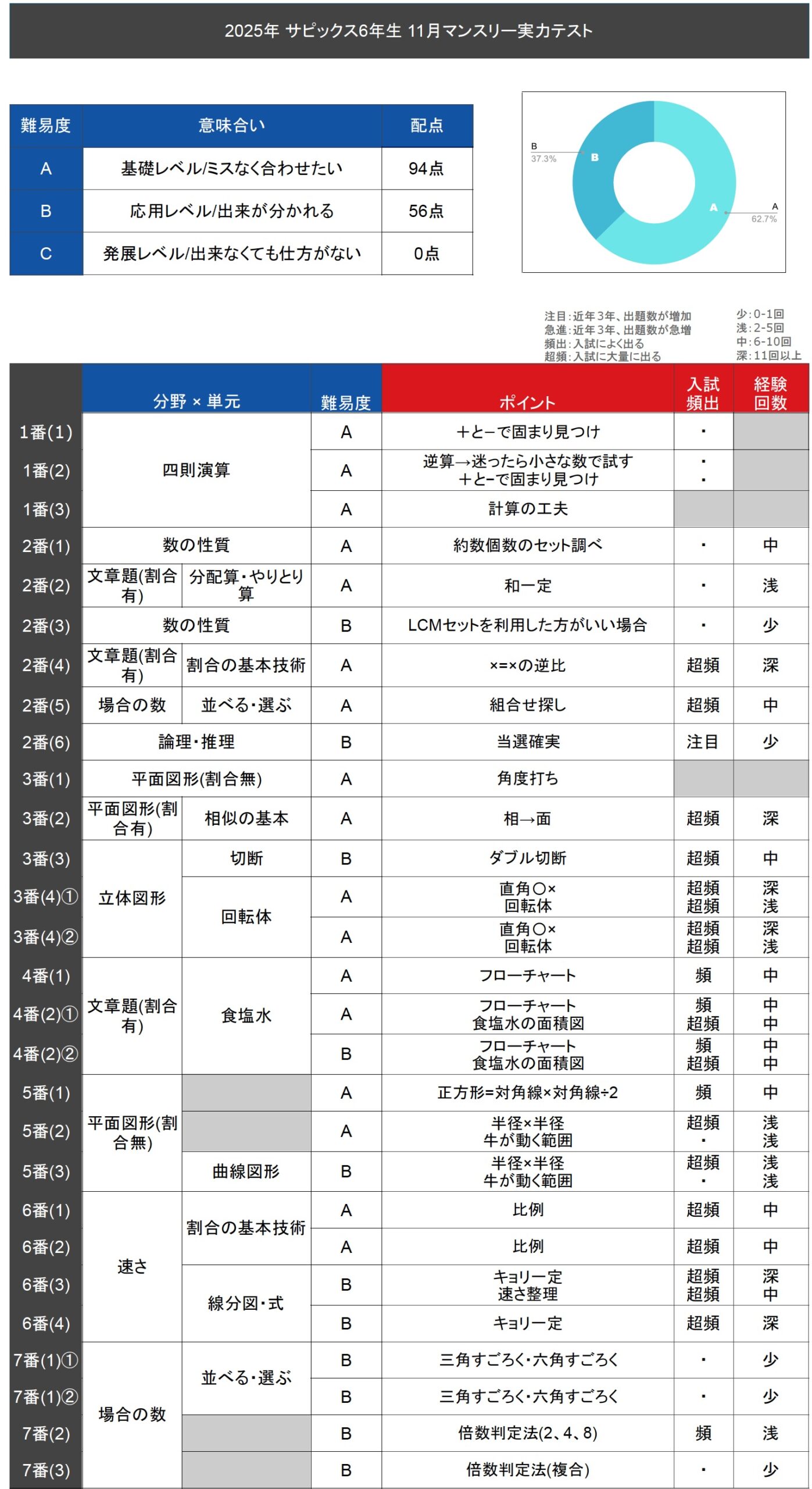 コベツバでは、2025年11月27日実施、 サピックス6年生 11月マンスリー実力テストの算数解説・難易度・所感を公開中です。