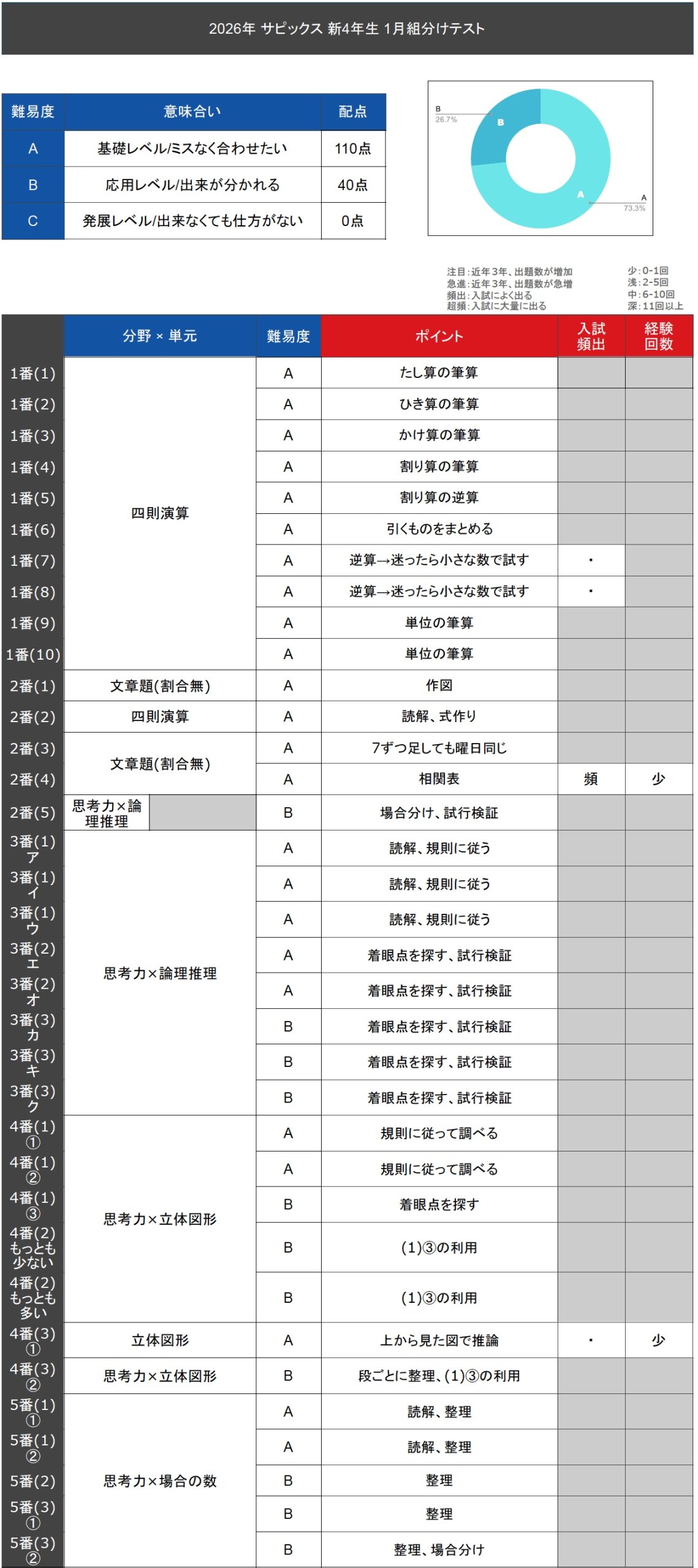 新4年生の1月の組分けテストは、時期的に習っている技術が少ないため、計算や簡単な技術が全体の4割、残り6割が思考力という構成になっており、対策が難しいテストです。
