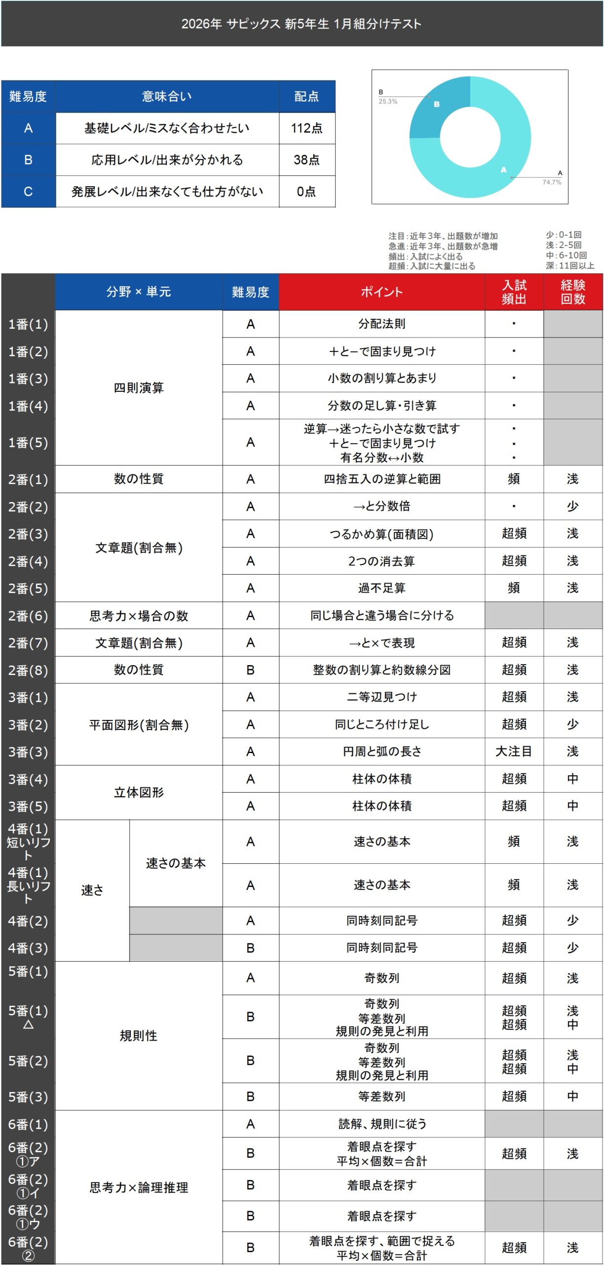 コベツバでは、2026年1月12日実施、 サピックス新5年生 1月組分けテストの算数解説・難易度・所感を公開中です。