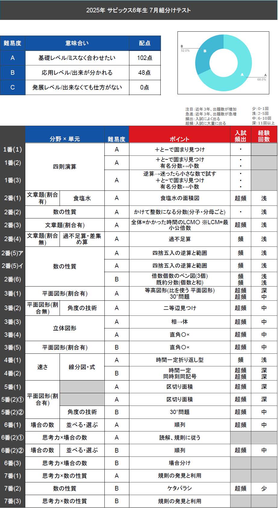 コベツバでは、2025年6月29日実施、 サピックス6年生 7月組分けテストの算数解説・難易度・所感を公開中です。