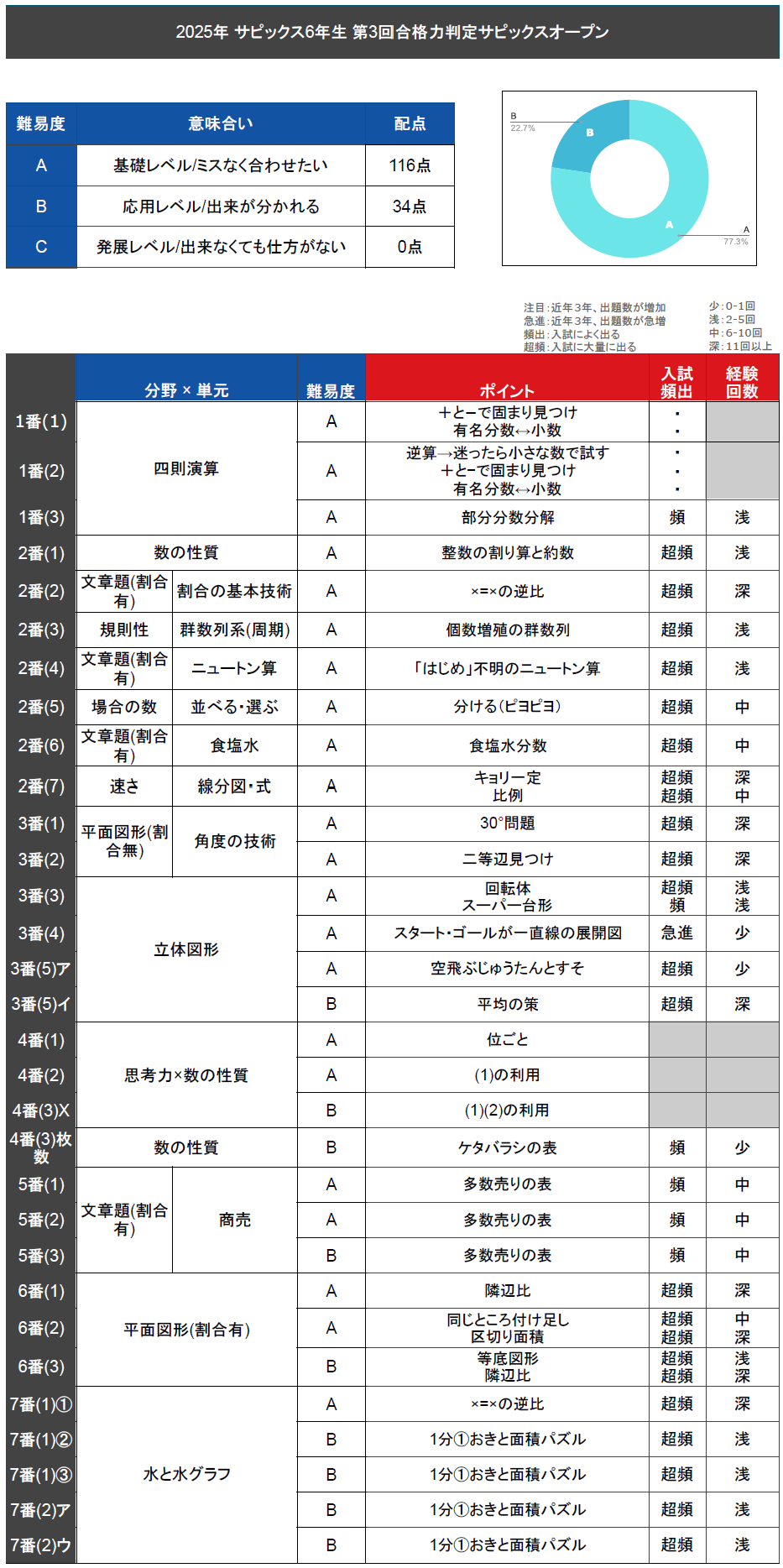 全体感を見ていきますと、レベルAが116点、残り34点がレベルBということで易し目の難易度セットとなりました。