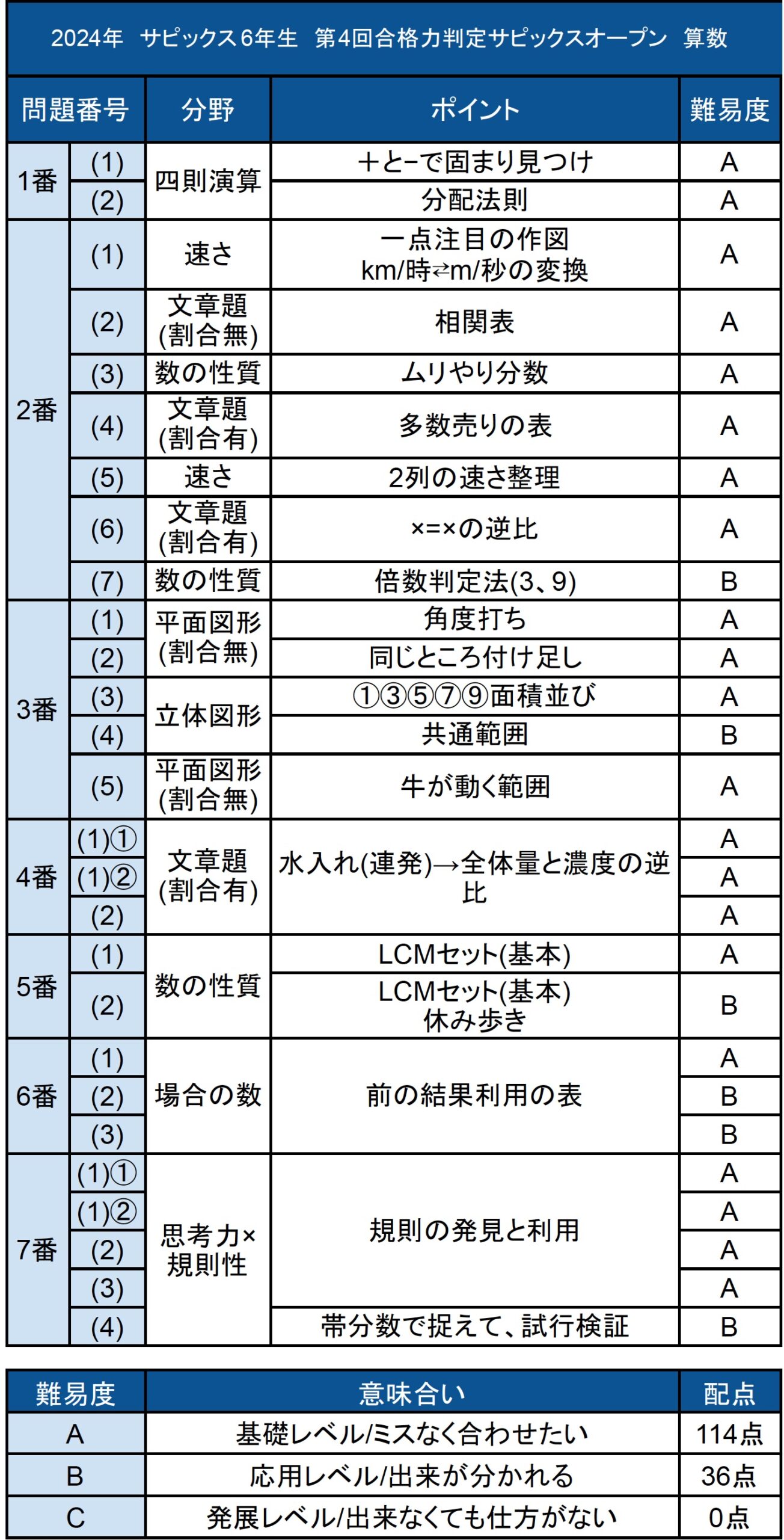 全体感を見ていきますと、レベルAが114点、残りがレベルBというやや易し目の難易度セットとなりました。