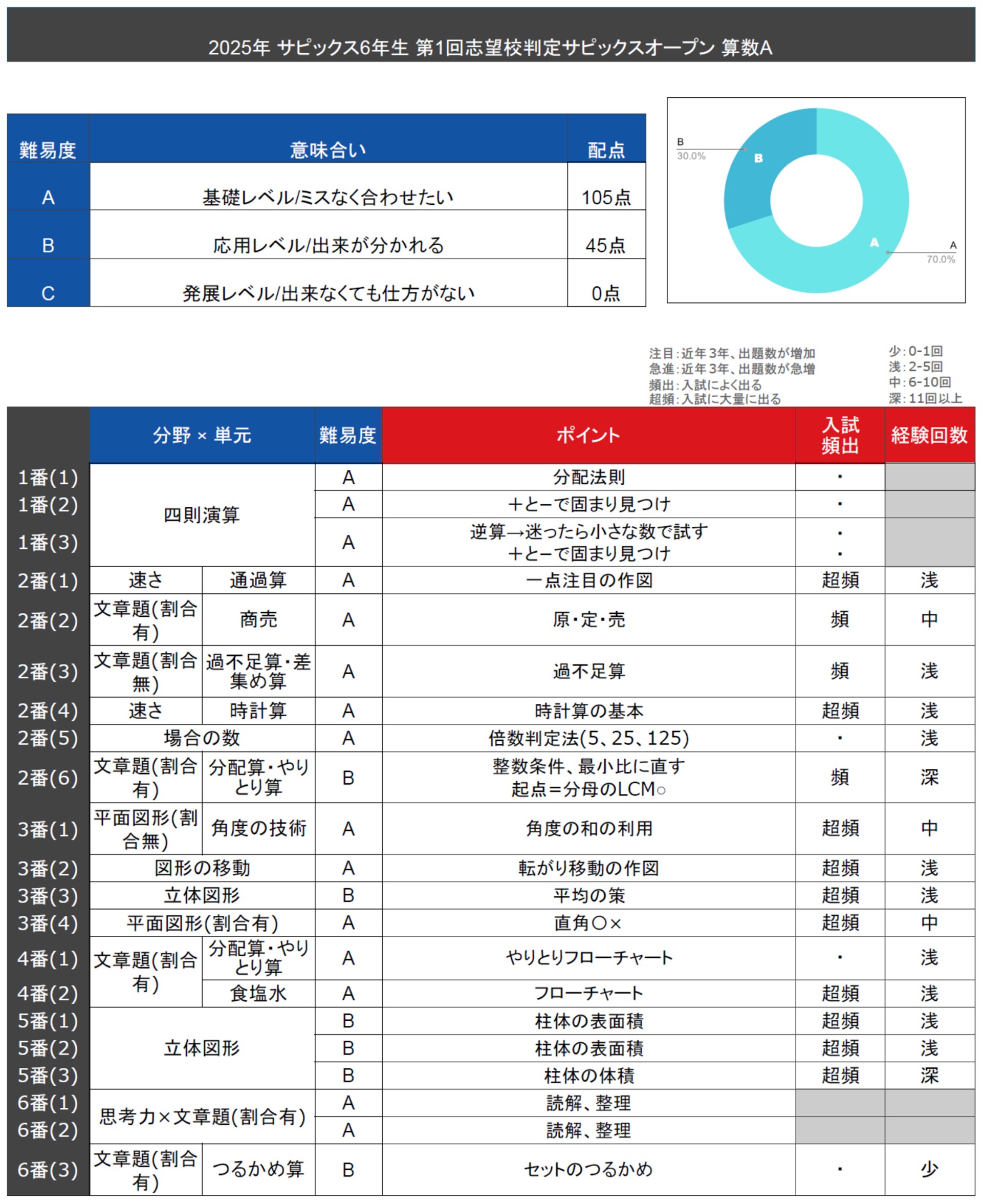 全体感を見ていきますと、レベルAが30点、レベルBが90点、レベルCが30点と極めて高い難易度のセットとなりました。