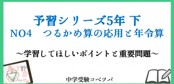 今回は復習中心のNOです。直近で学習したもの以外では、新しいものとして「真ん中影武者」、小4以来の復習としては「平均速度」を学ぶことになります。特に「真ん中影武者」は難関校で頻出の論点の為、志望者はしっかりと押さえる必要があります。