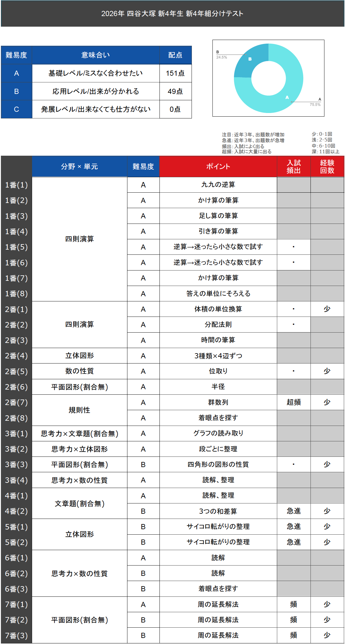 四谷大塚新4年生 新4年組分けテストの所感・難易度分析
