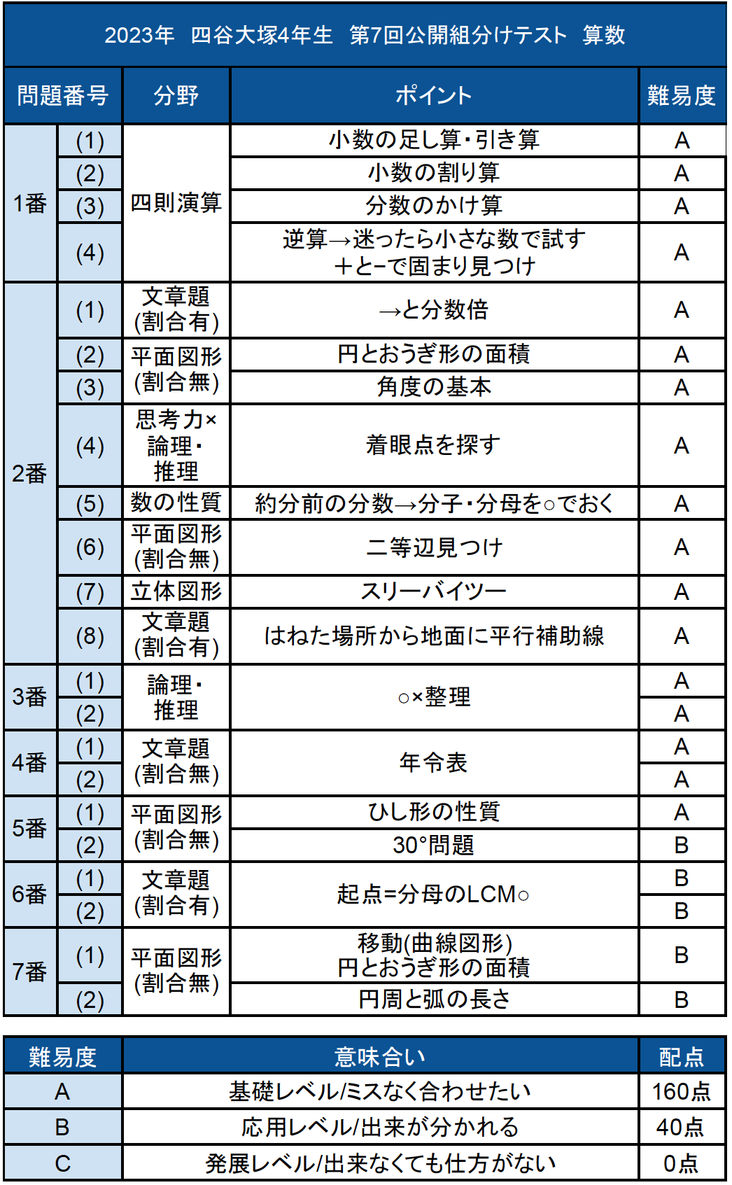 2023 年 11 月 11日実施、四谷大塚4年生第7回公開組分けテストの算数解説・難易度・所感を公開中です。