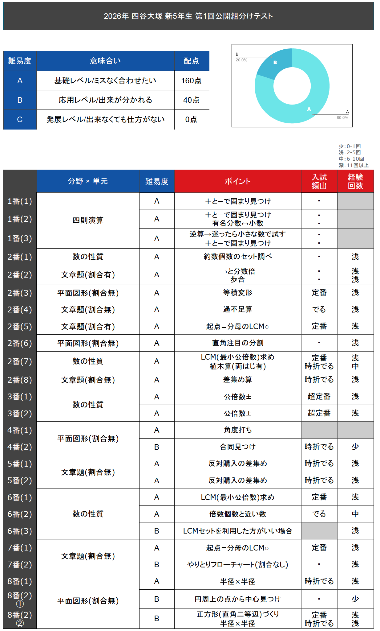 四谷大塚新5年生 第1回公開組分けテストの算数所感・難易度分析